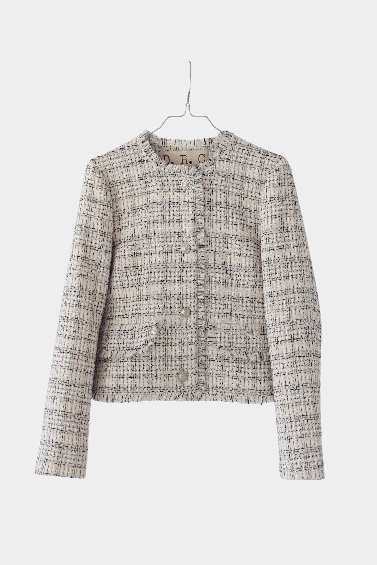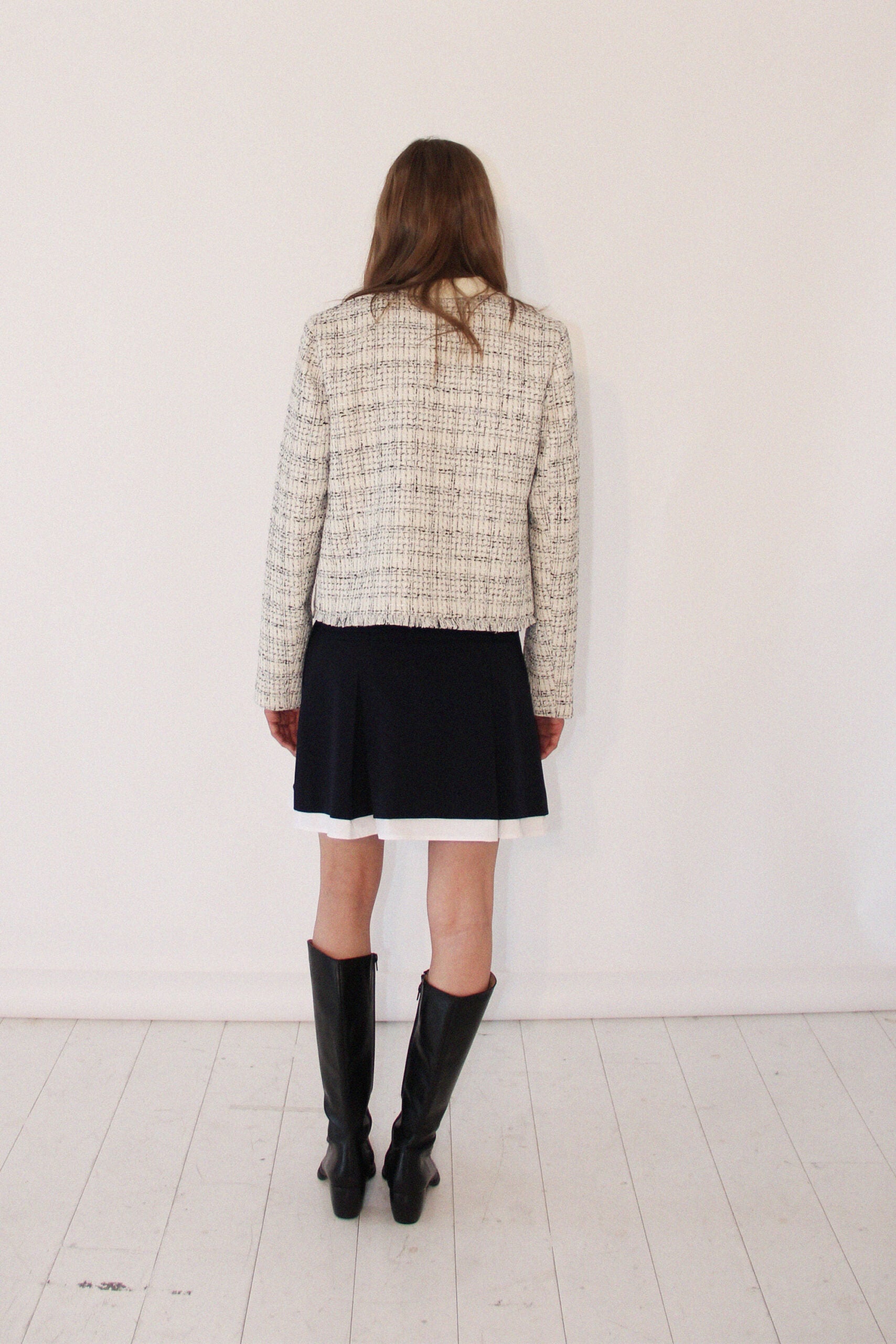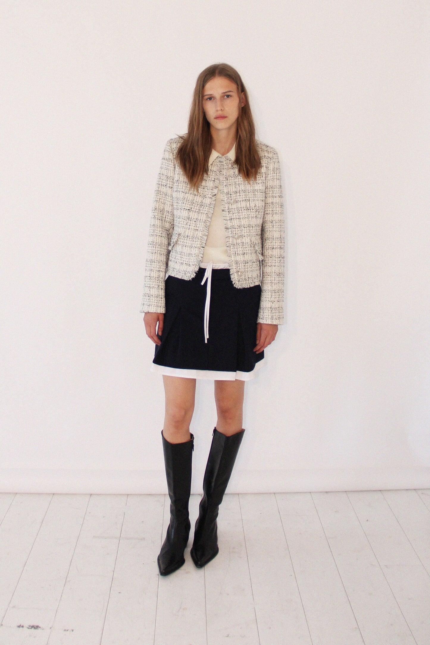 The Adeline Jacket er det perfekte plagget for å tilføre et sofistikert preg til ethvert antrekk. Denne korte bouclé-jakken kombinerer klassisk stil med en raffinert, teksturert overflate, noe som gjør den til en allsidig garderobefavoritt. Den elegante trådfinishen gir jakken et eksklusivt uttrykk, mens den nøytrale cream/black check-fargen gjør den enkel å style.