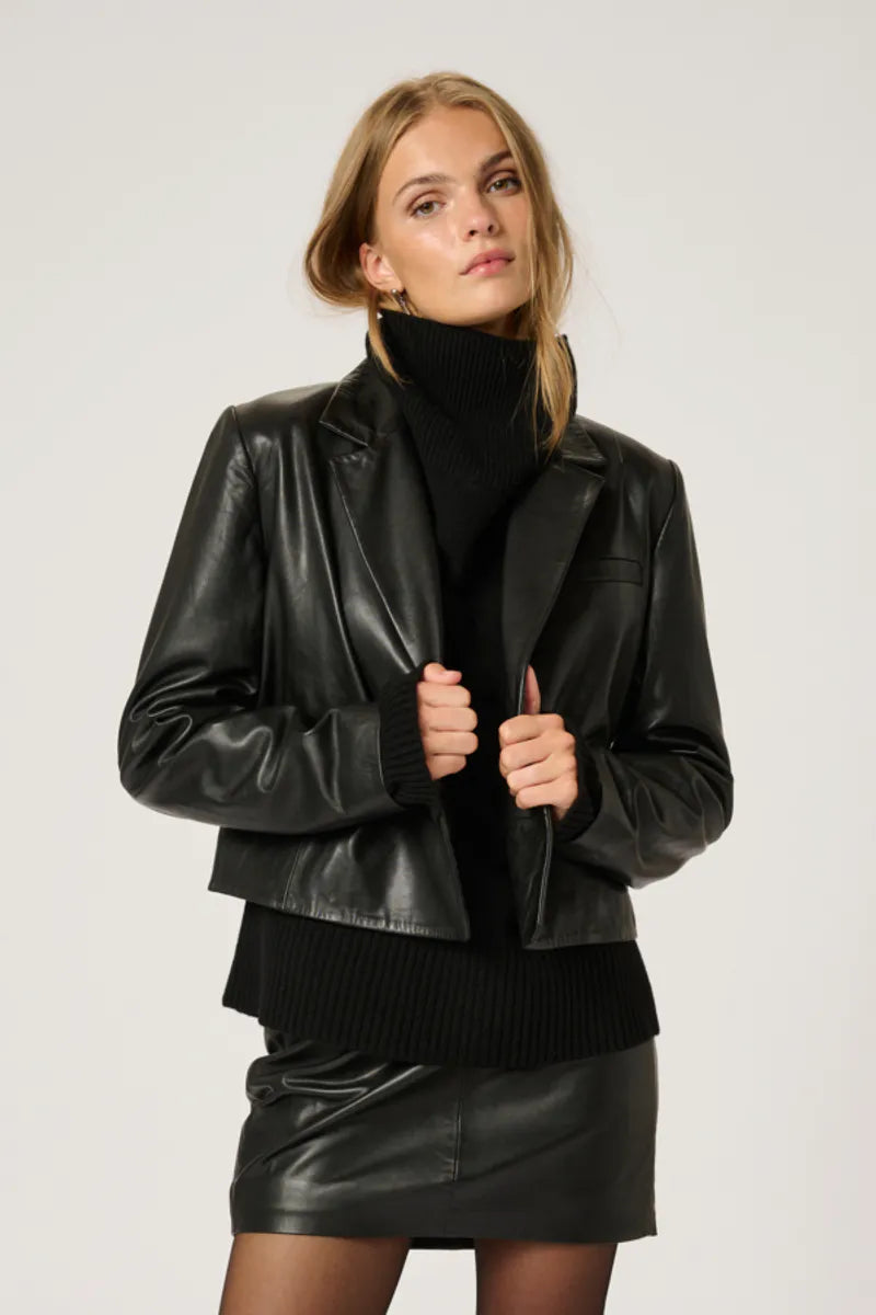 AkelaMW Blazer er en moderne og elegant blazer designet for å gi ethvert antrekk et sofistikert preg. Laget av 100% lammeskinn, har denne kortere blazeren en myk, luksuriøs tekstur som utstråler kvalitet og tidløs stil. Den har en avslappet passform og lange ermer, som gjør den komfortabel for både hverdagsbruk og spesielle anledninger.