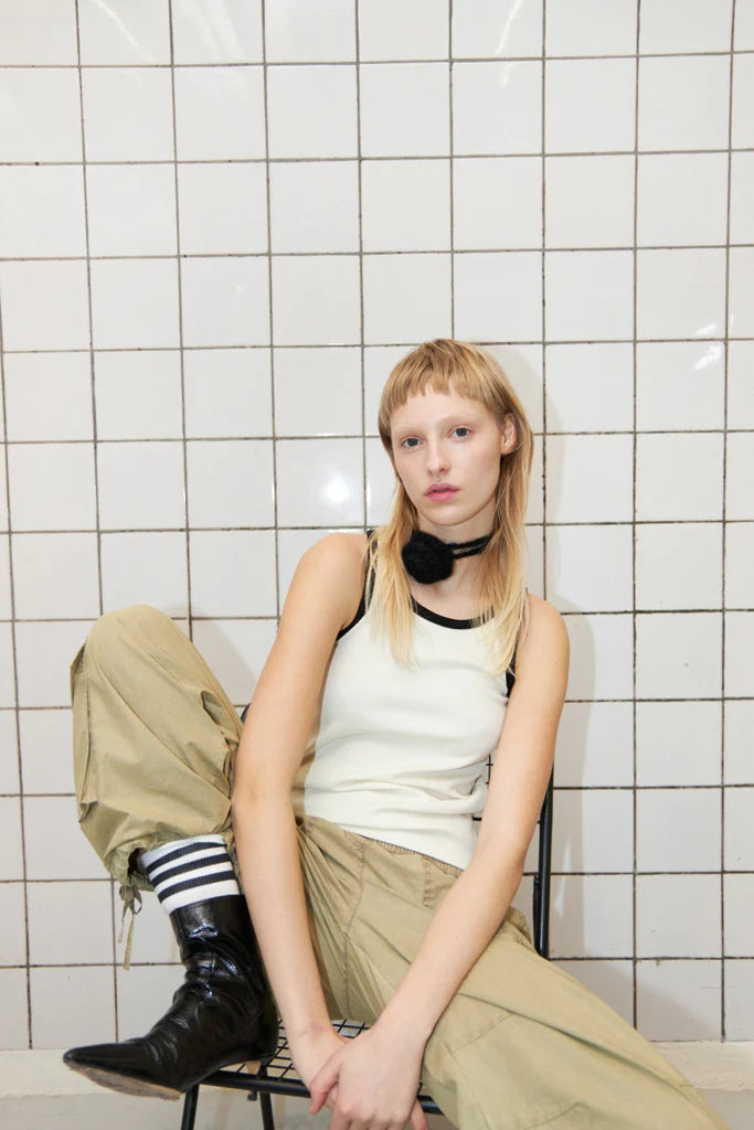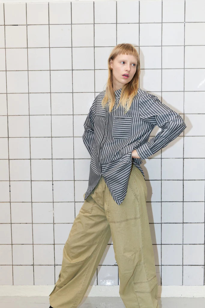 BETTY fra Dawn X Dare er våre nye cargobukser i papirbomull med en avslappet passform. Buksene har elastisk linning, to skrå sidelommer og to klafflommer på leggene. Buksene har justerbare snørebånd nederst på bena, slik at du kan enten beholde dem vide eller knytte snørebåndene. Papirbomullen gir en sprø følelse som ligner på fallskjermstoff og er tettere vevd enn vanlig bomull. Den er nesten vindtett. Stoffet er holdbart og sterkt.