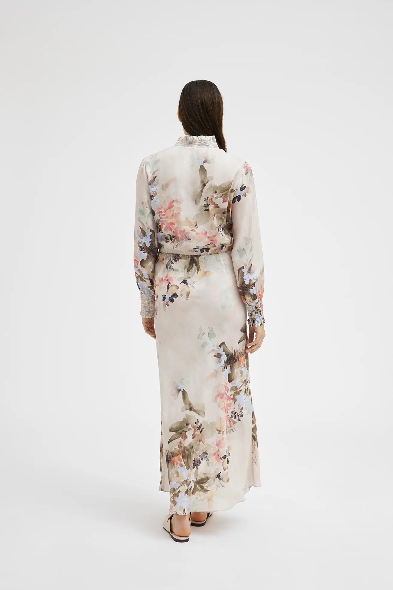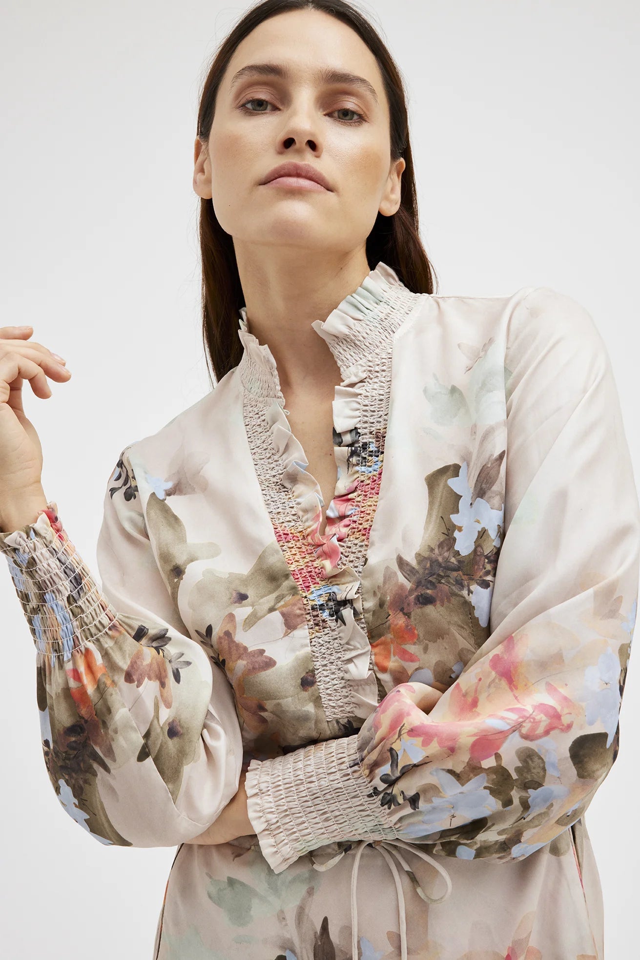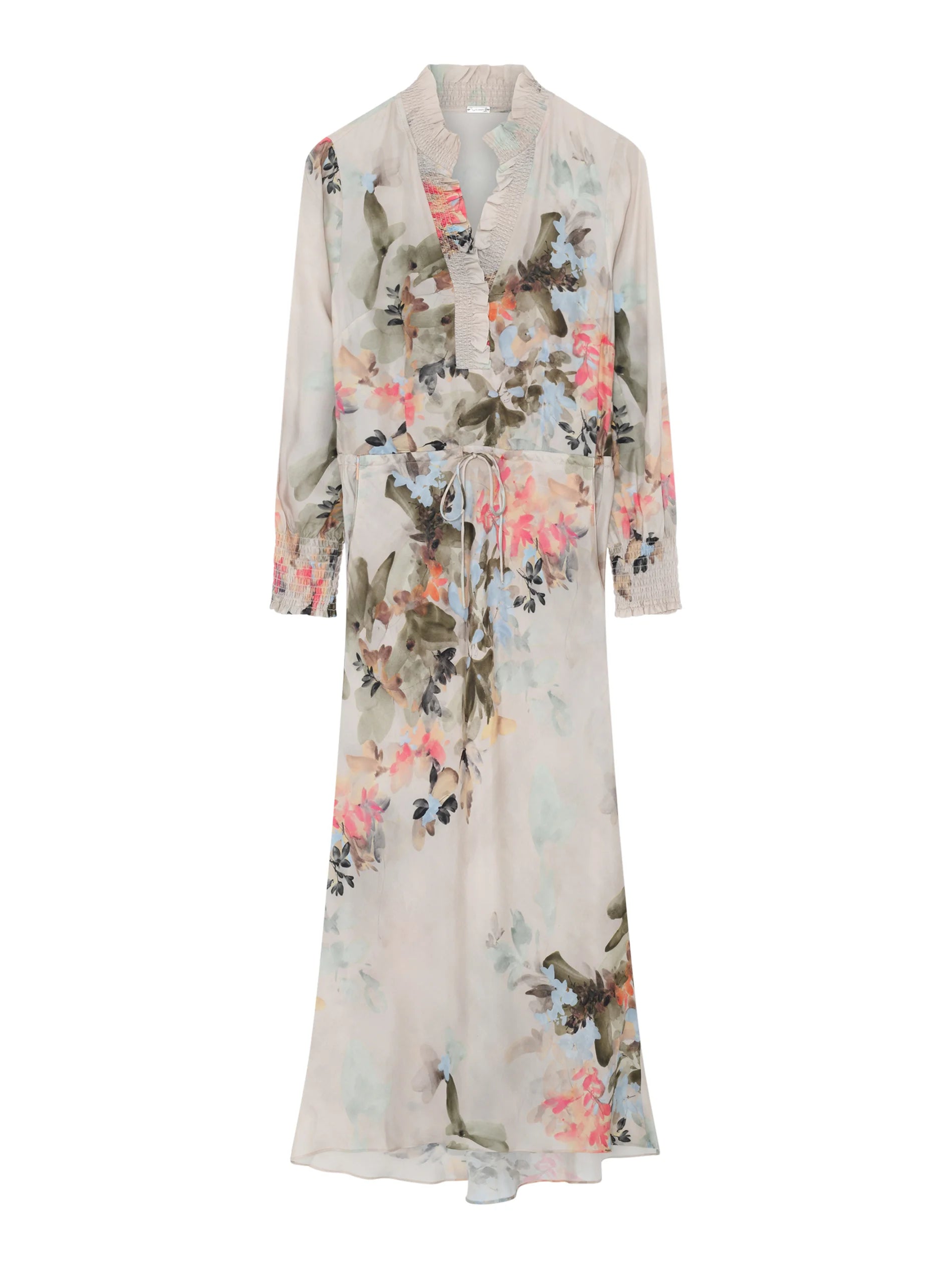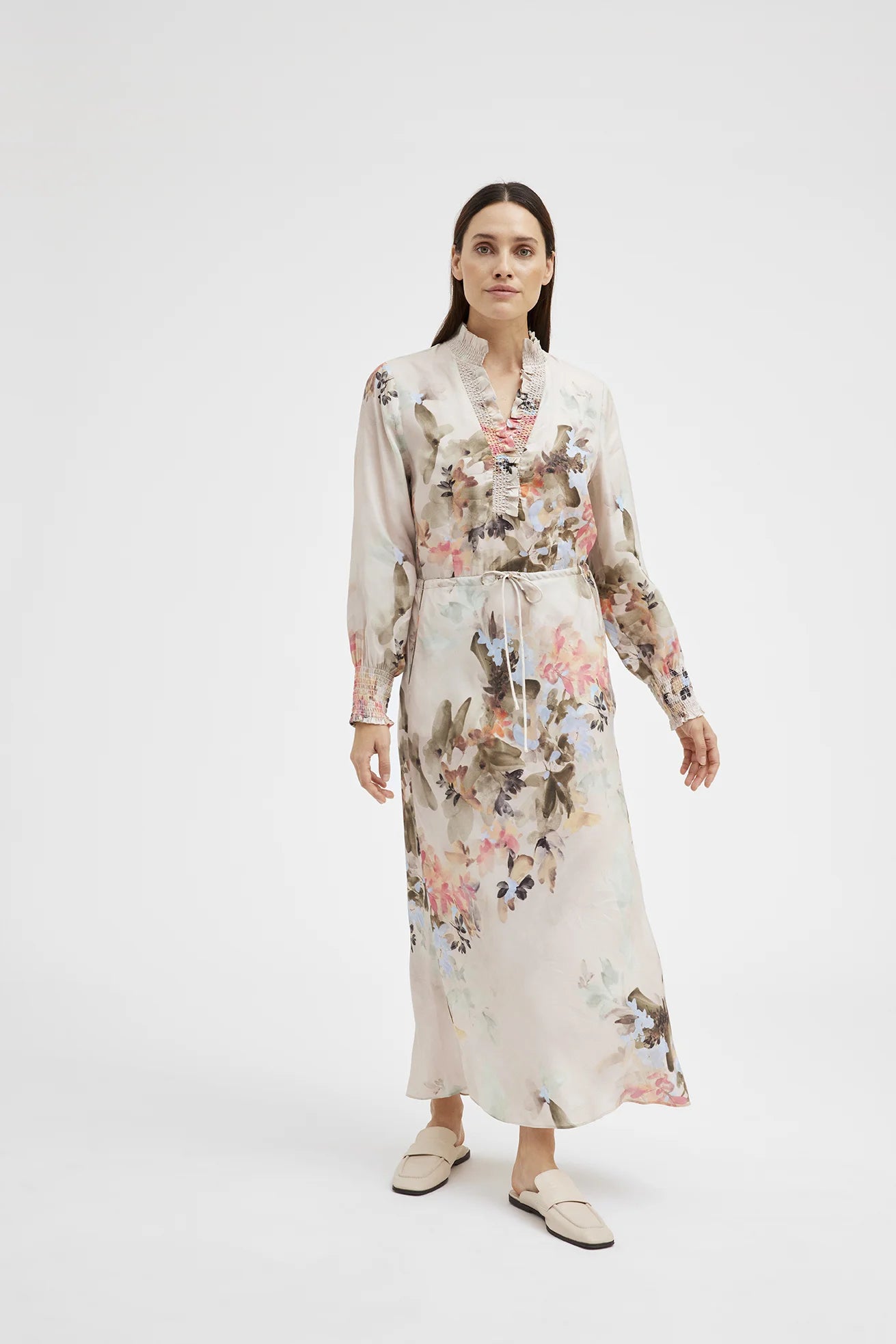 Utforsk den uimotståelige sjarmen til Britney Dress fra Gustav. Denne maxikjolen er laget for å omfavne din femininitet med sitt vakre blomstermønster og elegante design. Med lange ermer, knyting i livet og strikkdetaljer på ermene, tilbyr denne kjolen en perfekt balanse mellom stil og komfort.