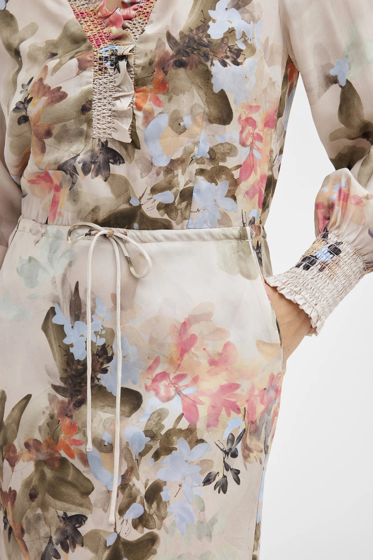 - Blomstermønster: Det blomstrete mønsteret gir kjolen et romantisk og sjarmerende utseende, perfekt for sesongen.