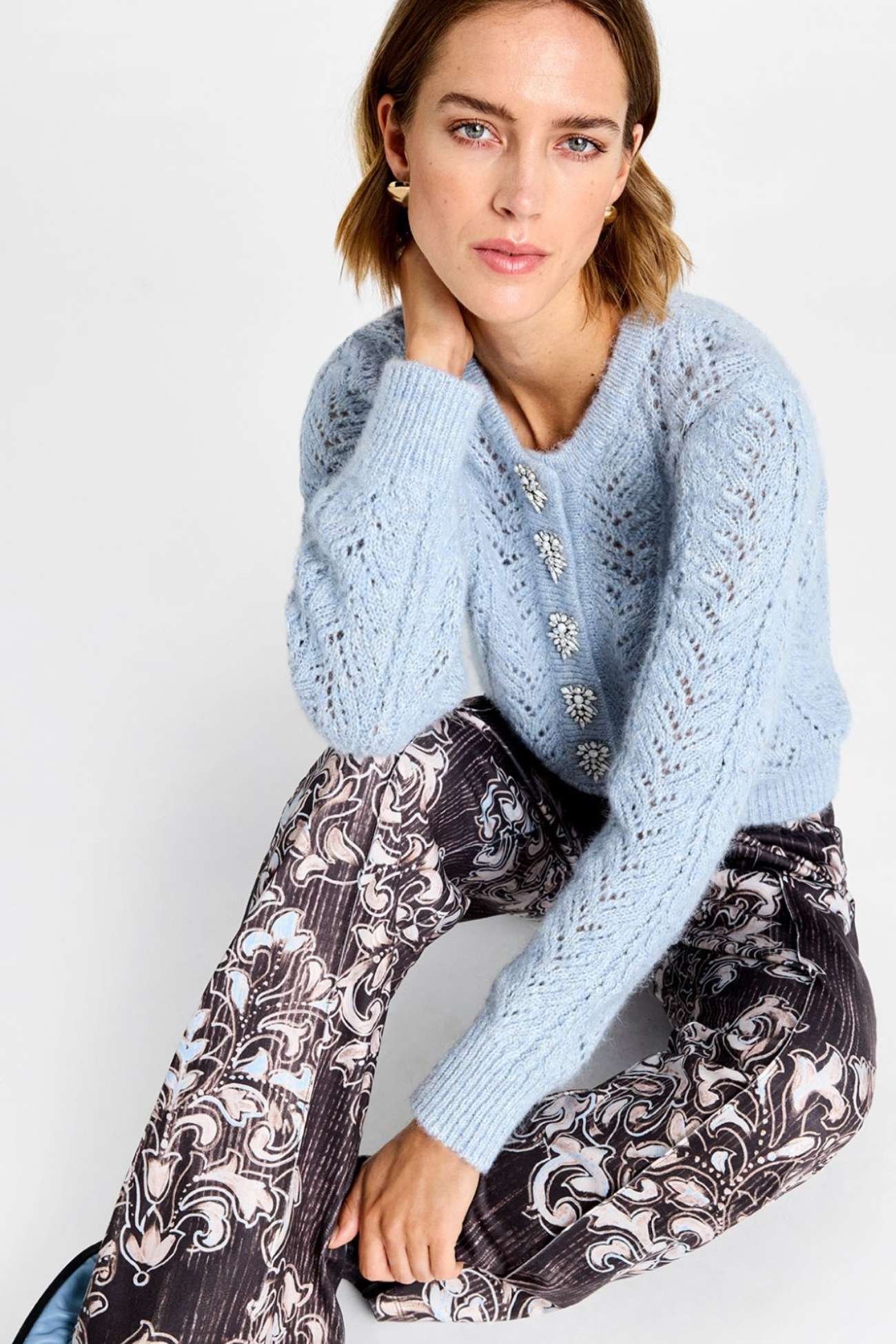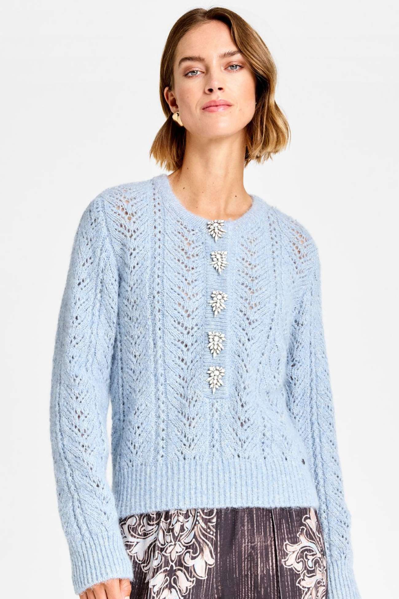 Nydelig lyseblå strikk med dekorative knapper i front. Genseren har et delikat hullmønster og myk, fluffy struktur som gir et feminint og lunt uttrykk.