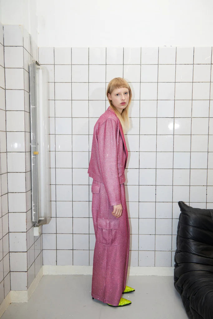 KASS Pants fra Dawn X Dare er kule metalliske cargobukser med elastisk linning, to skrå sidelommer, klafflommer på sidene av bena og knappede klafflommer bak. Buksene har vide ben og kan enkelt styles med en blazer, bluse eller en genser.