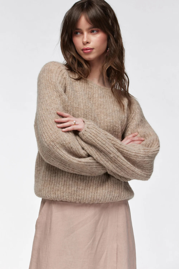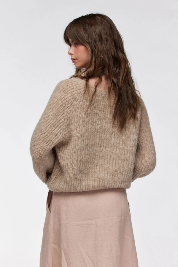Lerke genser er en fluffy og myk genser i 89% alpakka og 11% resirkulert polyamid. Patentstrikk gjør at den er både superlett og chunky på samme tid. Ballongeffekt på ermene og kant nede. Produsert av Woodling i Norge.