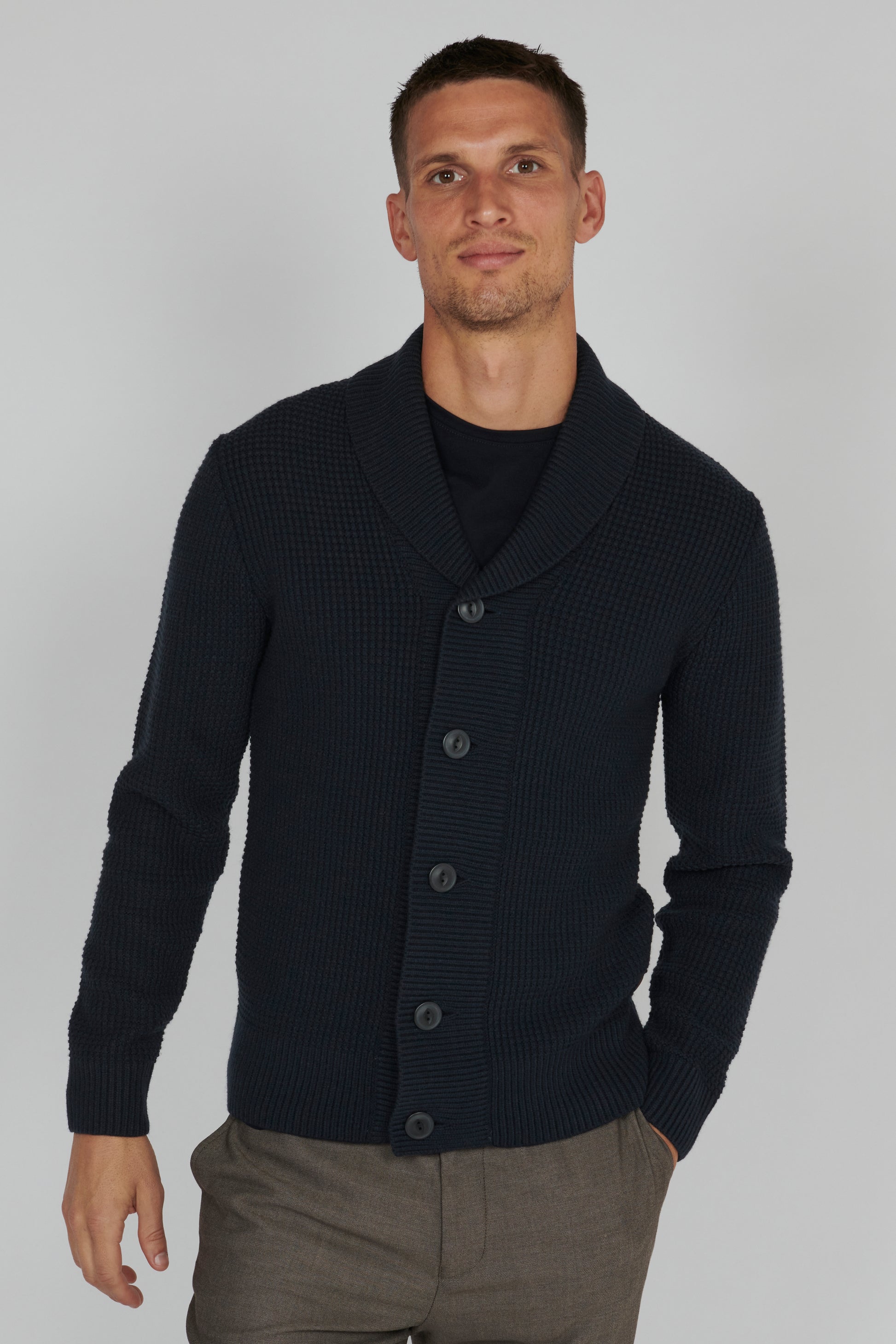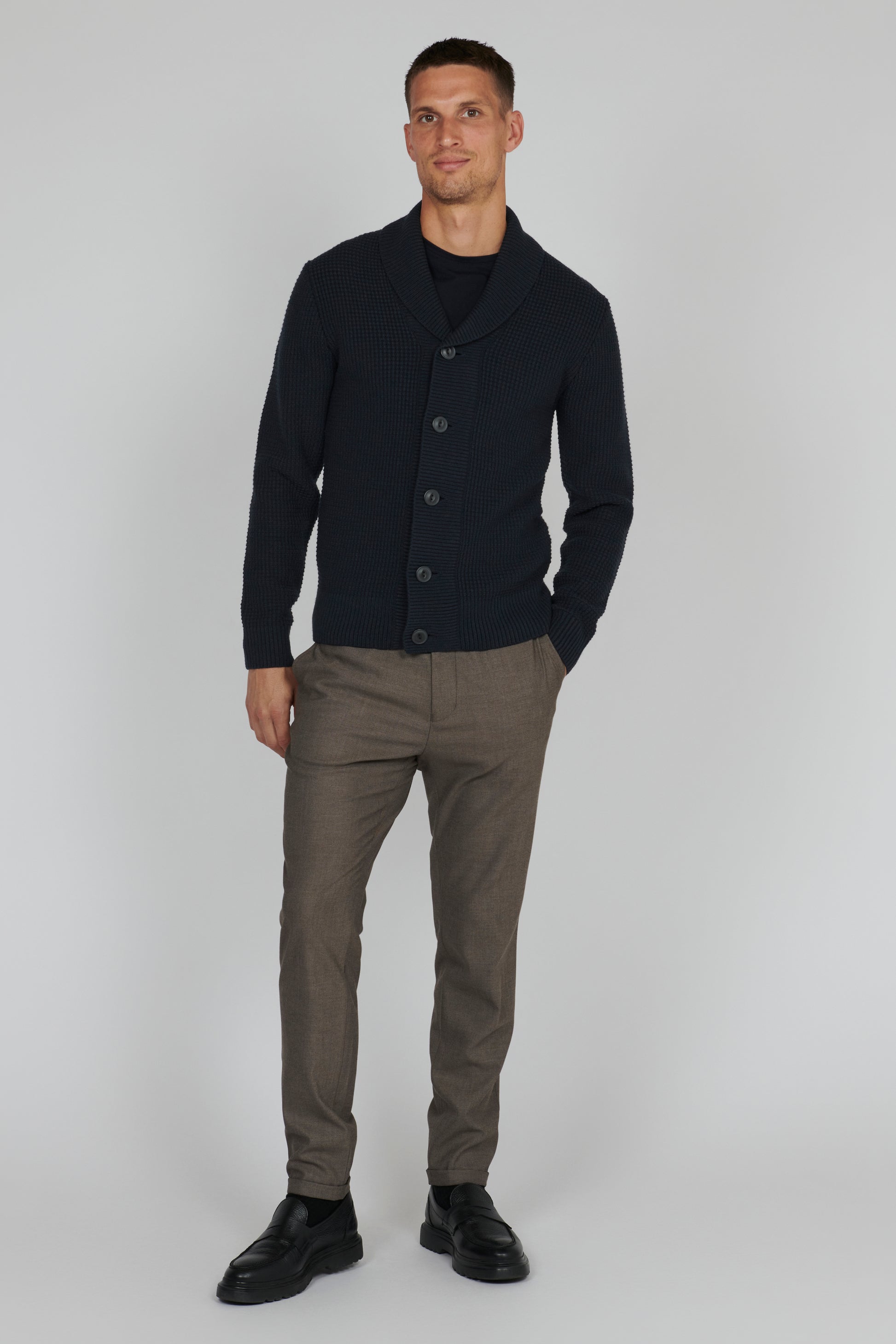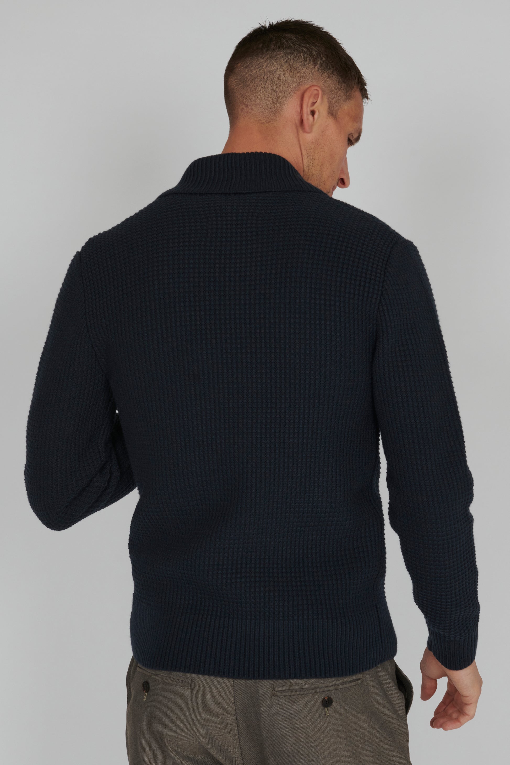 "MASHAWL CARDIGAN" kombinerer stil med varme i en regular fit cardigan. Laget av en blanding av 50% ull og 50% akryl, gir denne cardiganen deg ikke bare en myk og behagelig følelse, men også et klassisk og stilig uttrykk.