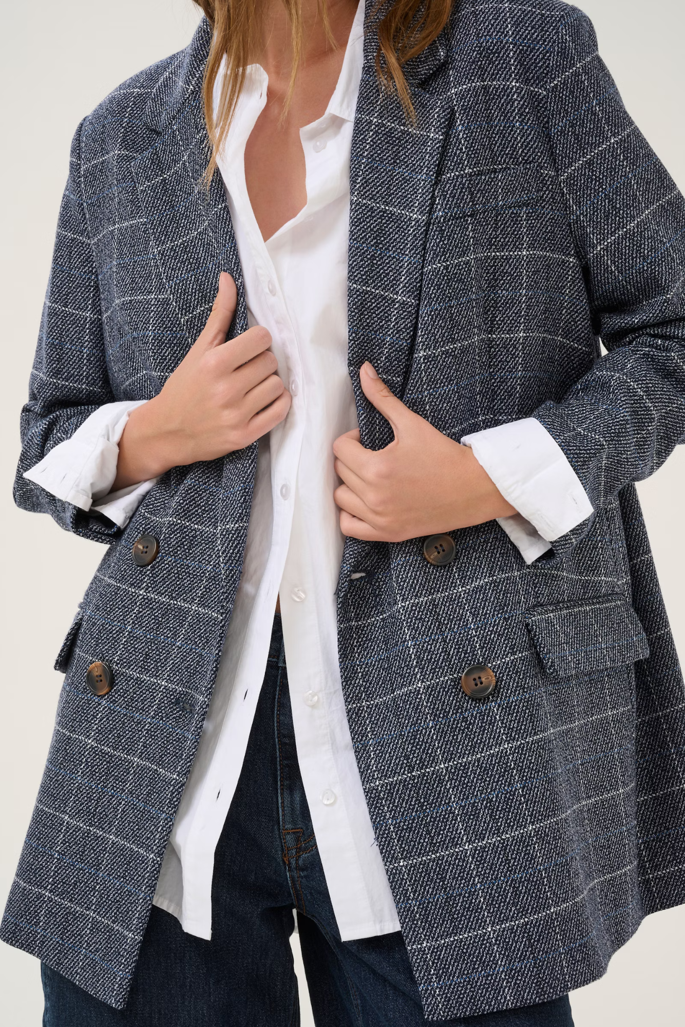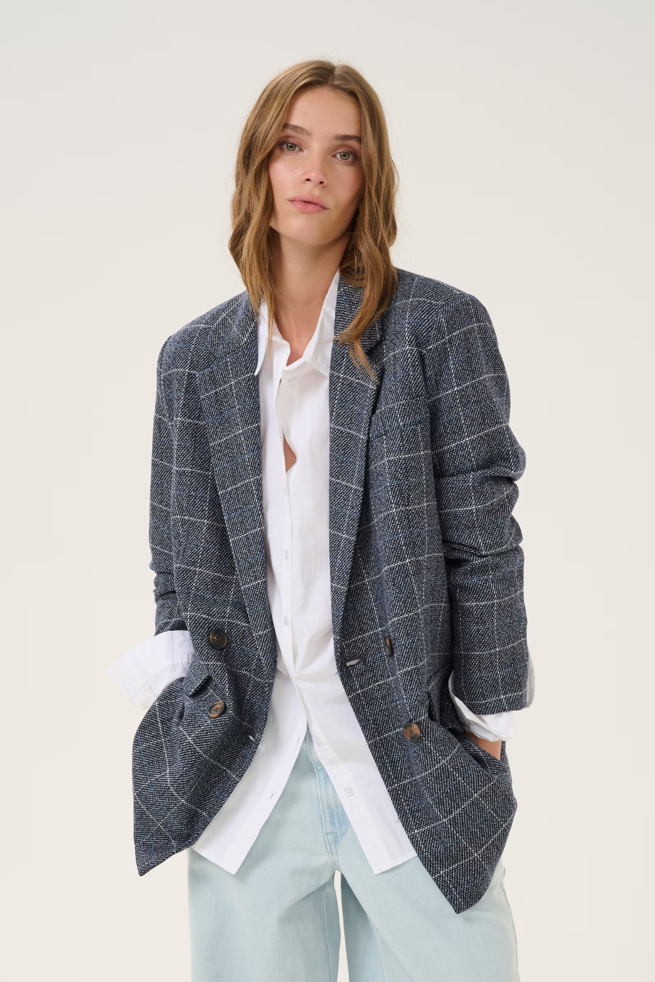 SavaMW Blazer er en stilren, rutete dobbeltspent blazer med en oversized passform som gir et sofistikert, men avslappet uttrykk. Designet kombinerer klassisk skreddersøm med moderne detaljer som to klafflommer, knapper på ermeavslutningene og helfôret innside for maksimal komfort og kvalitet.