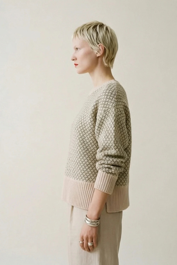 Strikket i en lett og luftig blanding av 33 % bomull, 20 % viskose, 25 % super kid mohair, 11 % nylon, 2 % lin og 2 % ull – en kvalitet som oppleves myk mot huden, med en subtil tekstur og naturlig fall.
