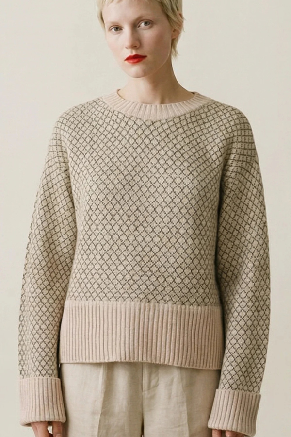 En kort genser med løs og avslappet passform. Den brede ribbekanten gir en definert avslutning mot bolen, mens de lange, vide ermene med oppbrett tilfører en myk struktur og et moderne uttrykk.