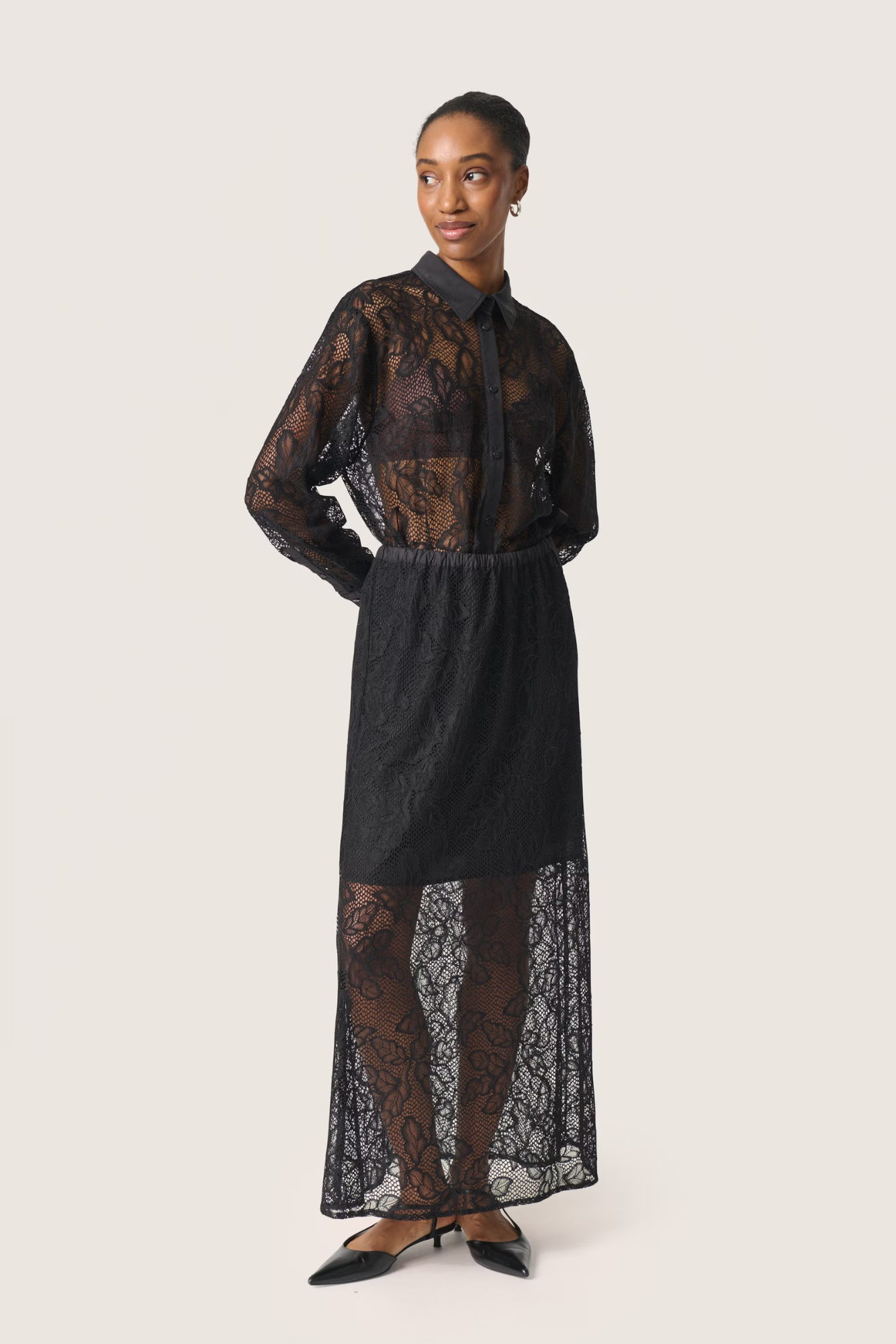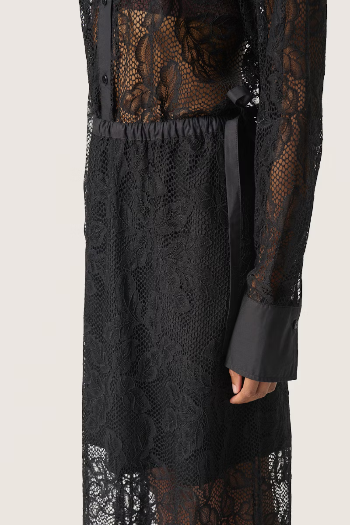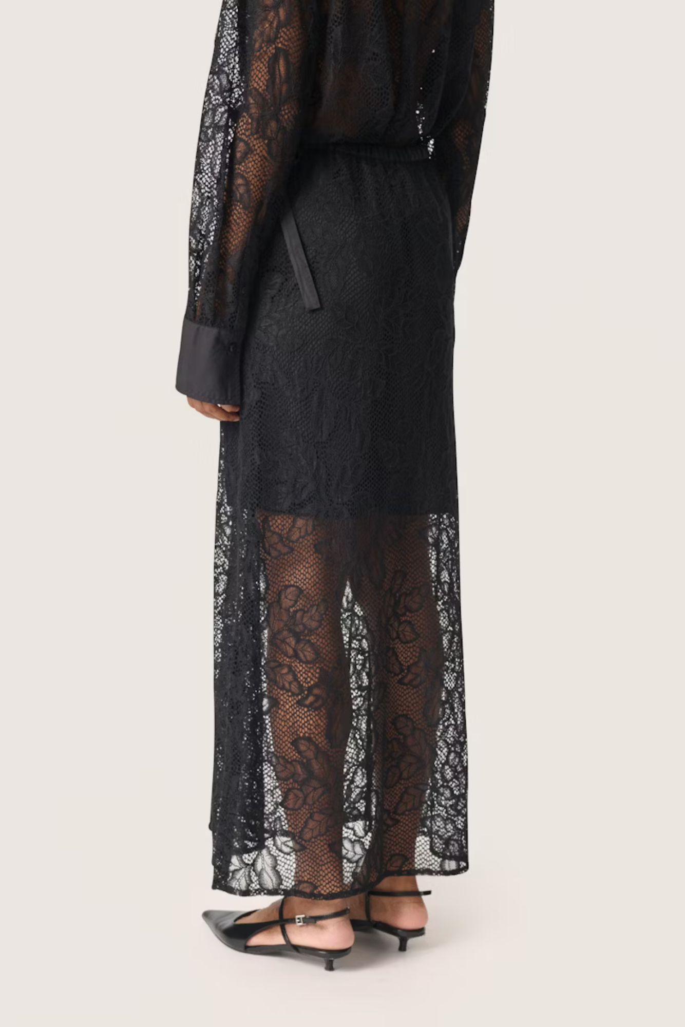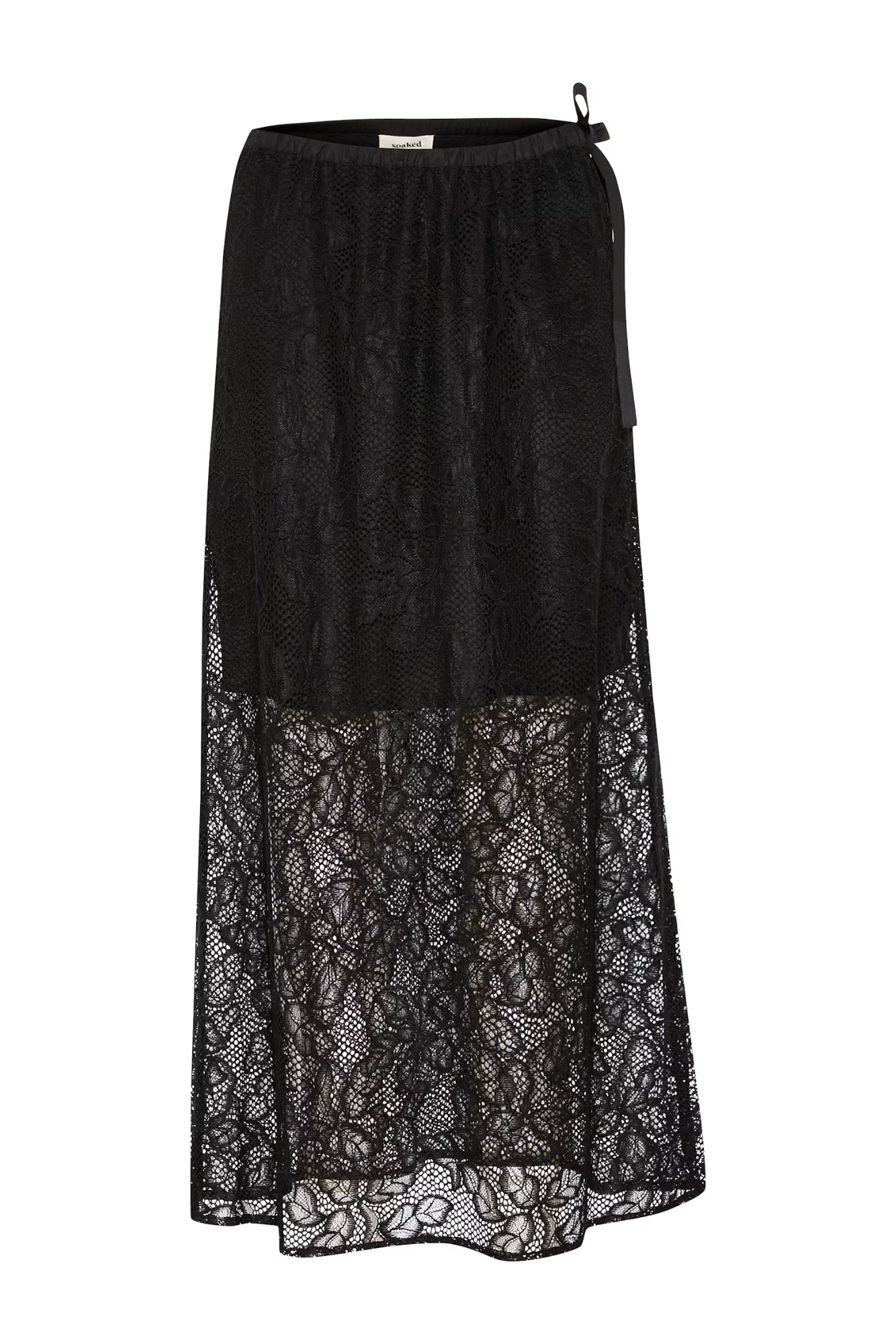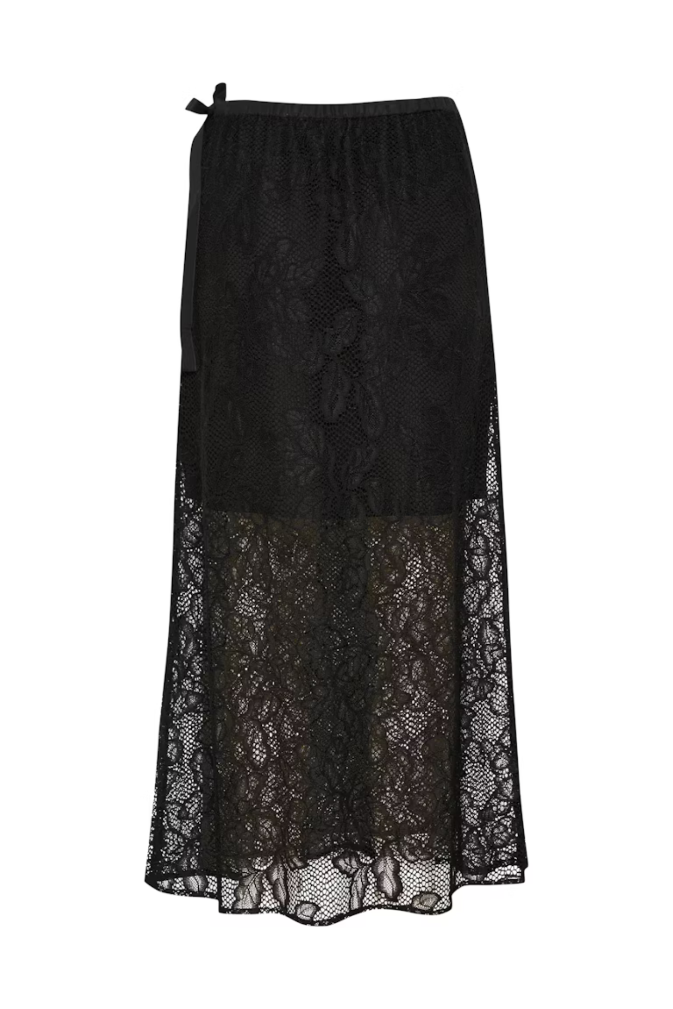 Dette elegante blondeskjørtet i maxilengde kombinerer transparent stoff med en feminin sløyfe i midjen. Den elastiske midjen gir en behagelig passform, mens det delikate designet gjør det perfekt for spesielle anledninger. Et tidløst plagg som tilfører eleganse og romantikk til enhver garderobe.