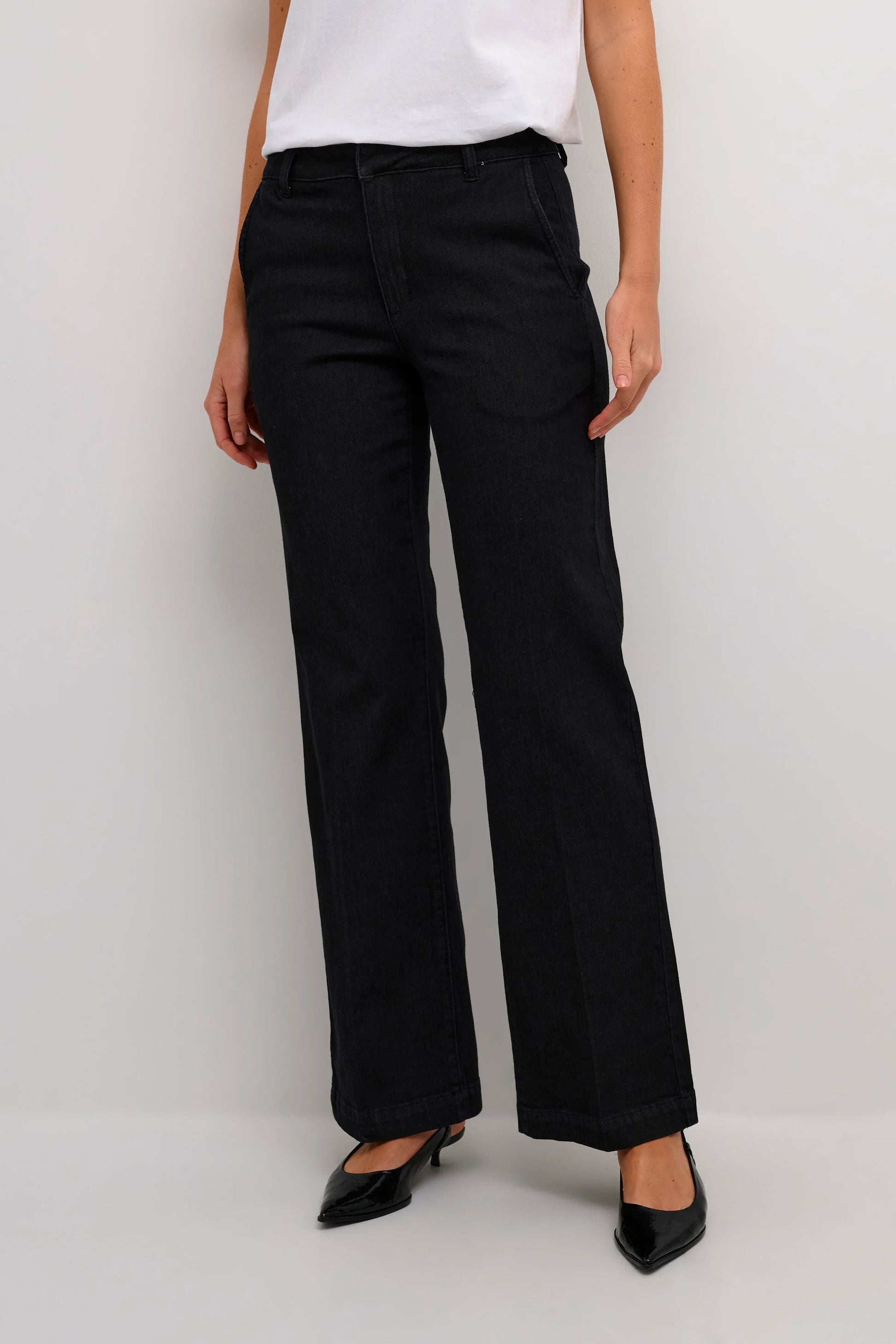 The Lara Pant fra My Essential Wardrobe er en favoritt blant mange, takket være sin kombinasjon av stil og komfort. Disse buksene har en løs passform med vide ben, noe som gir en avslappet, men samtidig trendy look. Den ultrasofte stoffblandingen med superkomfort stretch gir en fantastisk følelse hele dagen. Med en denim-inspirert stil, middels høyde i livet, og en flatterende silhuett, er disse buksene et perfekt valg for både hverdagsbruk og spesielle anledninger.