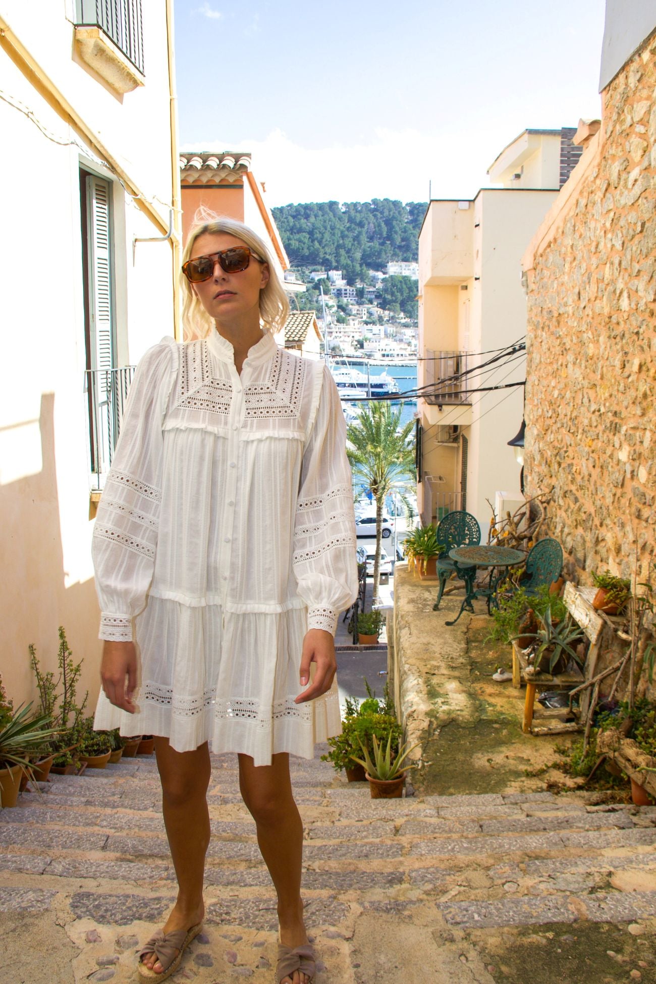 Feminin og tidløs! Denne korte kjolen kombinerer klassisk design med delikate blondedetaljer for et elegant uttrykk. Med en flatterende passform, lange ermer og knappelukking er den like fin til hverdags som til spesielle anledninger.